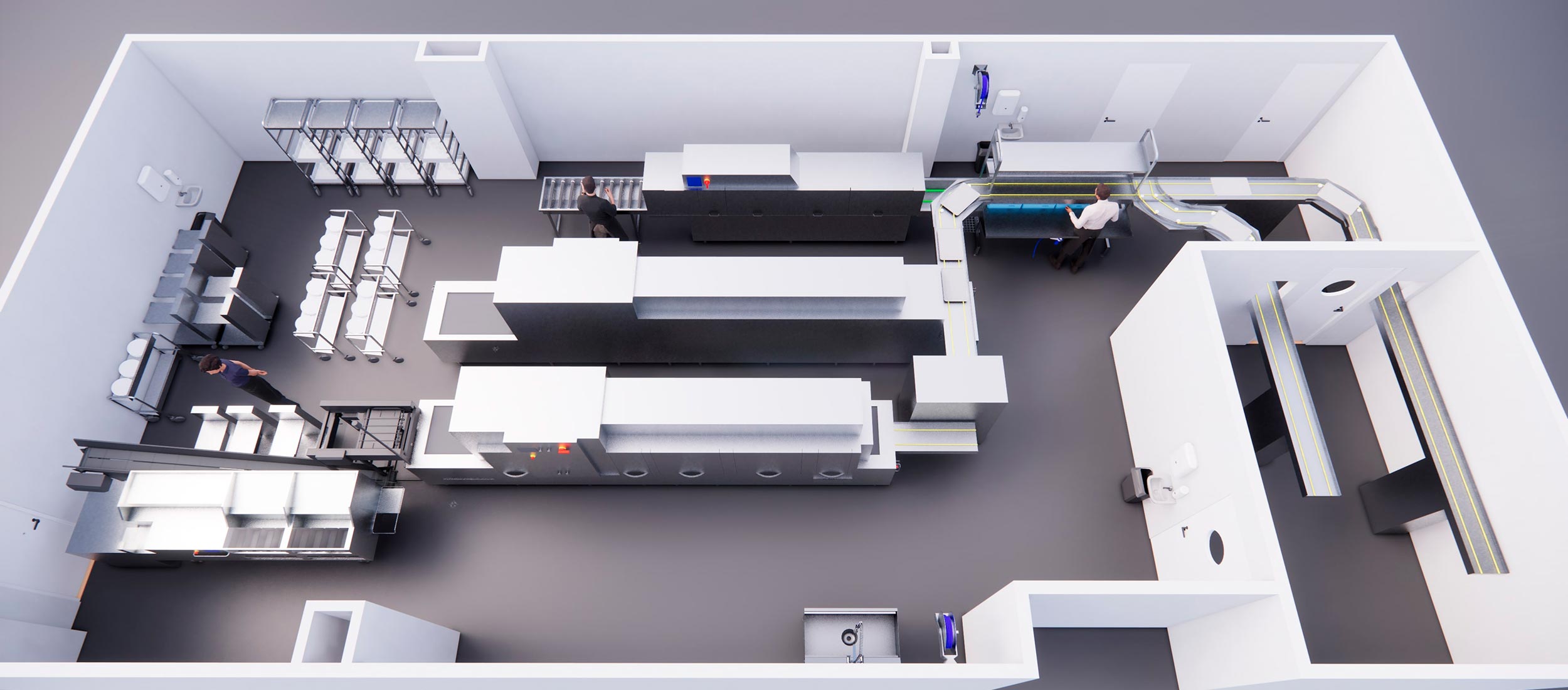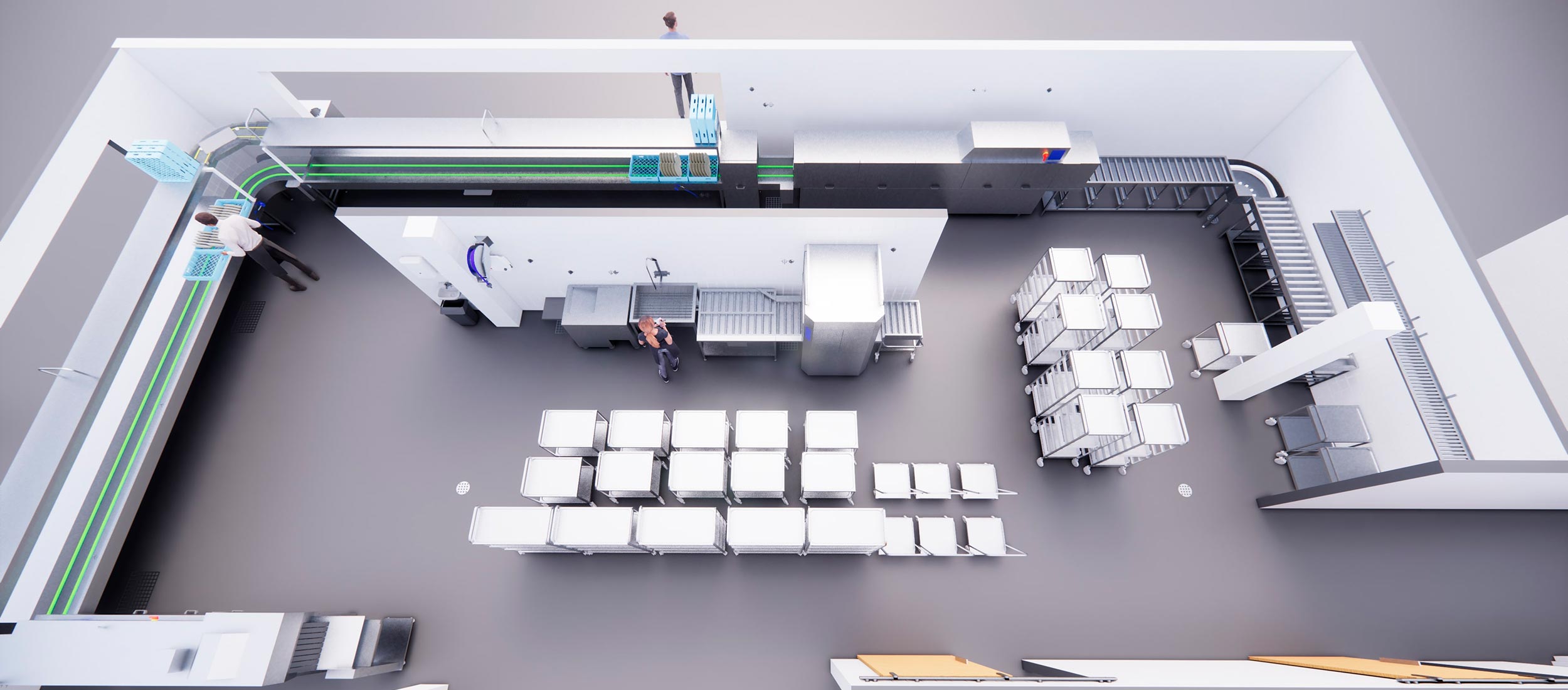 The number and quality of the dishes to be washed give their own criteria for the dish handling. The circulation of the dishes must be efficient, safe and ergonomic for the workers. Hand-lifted loads, such as baskets and stacks of dishes, must not be too heavy. Low noise levels, good lighting, ventilation and the right working temperature are also essential for a pleasant working environment.